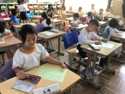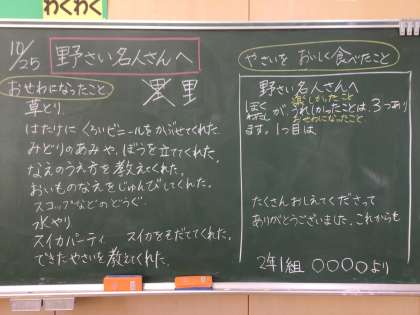 11月には、サツマイモ掘りを計画しています。サツマイモ掘りの日に、1、2年生はやさい名人さんに感謝する会を計画しています。10/25の2年生の生活科では、やさい名人さんへの感謝の手紙を書いていました。黒板には、この半年間にお世話になったことが、いっぱい書いてありました。