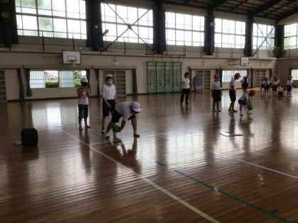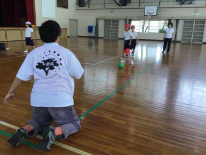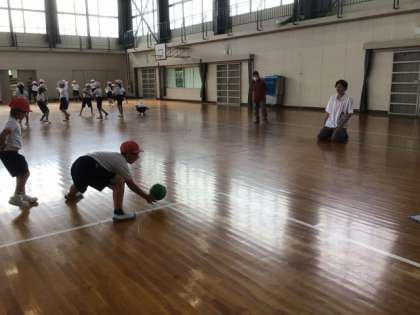 5mほどの距離から教員が転がしたボールを、児童は移動してキャッチしました。キャッチすると、すばやく教員に向かってボールを転がしていました。練習するに従って、動きが徐々にスムーズになりました。
