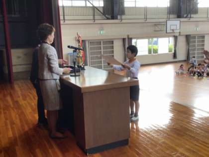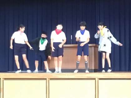 校長先生のお話の後、表彰伝達を行いました。その後、保健委員さんが、学校生活の中でけがを予防するために、普段から体操をすることの大切さを伝えるために、全校児童の前で劇を披露しました。