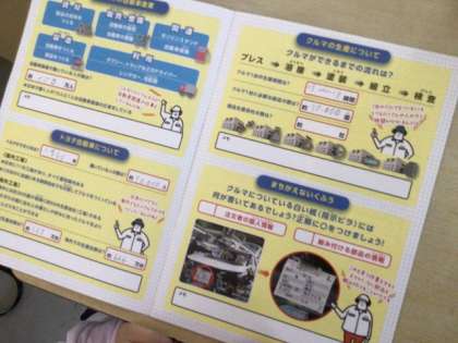児童はまず車づくりの流れを動画で学び、次に「間違えない工夫」や「働きやすい工夫」など、トヨタ自動車ならではの工夫について学びました。