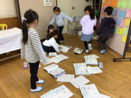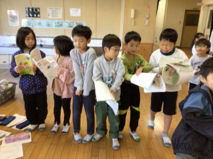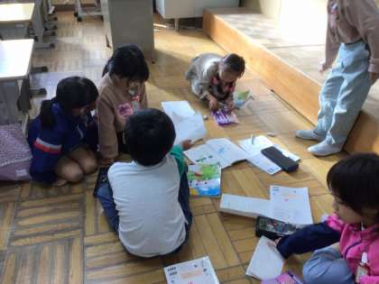 1年生は学年発表会で「大きなかぶ」のお話を劇で発表し、それに加えて1年生で学んだことを発表します。11/7の授業では、1年生児童がチームに分かれてセリフの練習をしていました。