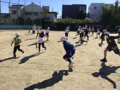 3班は「だるまさんのしっぽとり」。「だるまさんがころんだ」と掛け声がかかると、しっぽとりをして走り回っていた子は、ピタッと止まりました。
