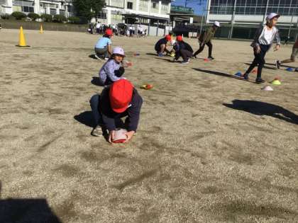 4班は「マーカー返し」。地面に並んだマーカーを、どれだけ早く裏返しにできるかを競いました。