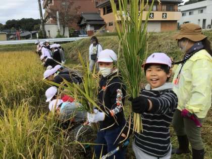 児童は片手で握れるだけの分量を刈り取り、それをコンバインに持ち運んで脱穀していただきました。児童は泥と格闘しながらも、稲を刈り取りながら進んでいきました。刈り取った稲を手にすると、児童ははじけんばかりの笑顔を見せてくれました。