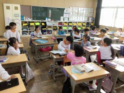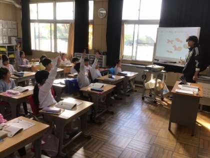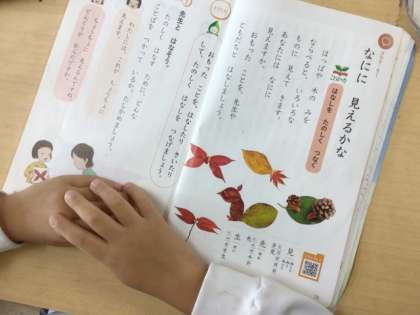 11/11の授業では、教科書の絵を見て、何に見えるかを考え発表しました。「左上の絵は、ちょうちょに見えます」と発表した児童がいました。それに対してお友達が、「なぜですか?」と質問しました。すると、「葉っぱの形が、ちょうの羽に見えるからです」と、きちんと理由をつけて答えていました。