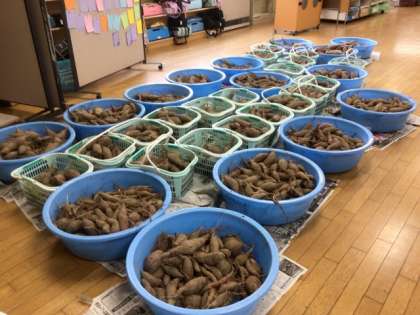 今年のサツマイモは大豊作でした。1年生の廊下に並べて熟成しています。