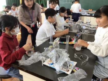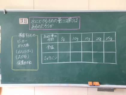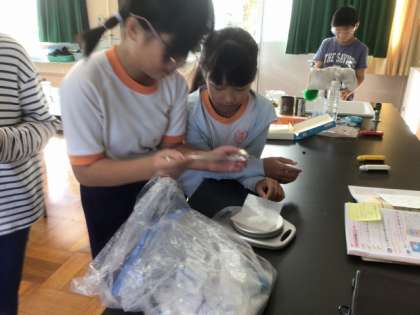 11/13の学習では、「食塩」「ミョウバン」をそれぞれ水に溶かして、溶ける量に限りがあるかを調べました。児童は、溶かす物質の量を量り取りながら、ビーカーの中で溶かしていました。
