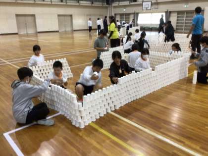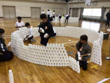 まず、講師のみなさんが持ってきた紙コップを積み重ねて、児童は思い思いに建築物の模型を作りました。グループで話し合い、役割分担をしながら作っていました。