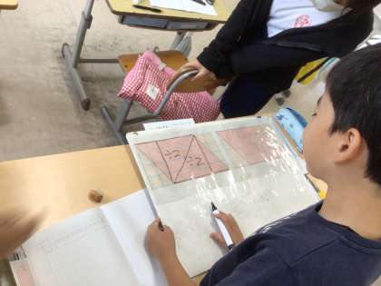 11/14の学習では、平行四辺形の面積の求め方を考えました。平行四辺形を切ったり、繋げたりして長方形にして、その面積を求めていました。