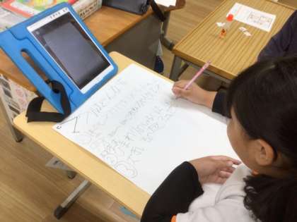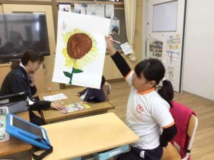 11/14の学習では、ヒマワリについて調べた児童が、画用紙に調べた内容と絵を描いていました。