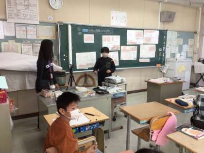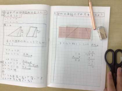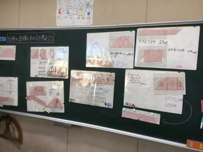11/21の授業では、台形の面積の求め方を考えました。班ごとに、台形を切ったり、貼ったりしながら長方形の形を作り出して、面積を求めていました。班で考えた求め方を、みんなの前で発表していました。