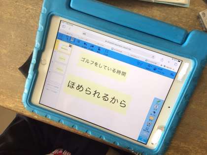 11/27の授業では、自分の好きな時間を思い出し、なぜ好きなのかを考えました。クラスのみんなに紹介するために、学習用タブレットに紹介文を書きました。書いた文を、班の友達に発表しました。