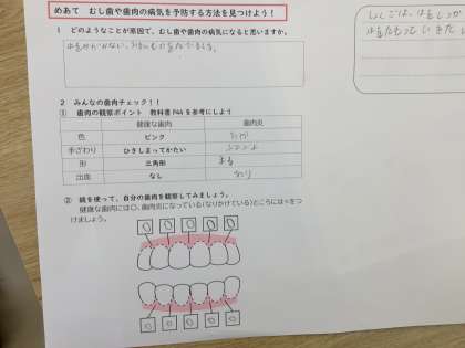 11/27の授業では、養護教諭が授業を行い、虫歯や歯ぐきの病気の原因は何かを学びました。まず、自分の歯ぐきの状態を知るために、歯ぐきを鏡で観察したり、歯ぐきを触って確かめたりしました。続いて、教科書で、虫歯や歯ぐきの病気になる原因を学びました。
