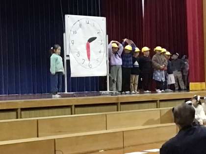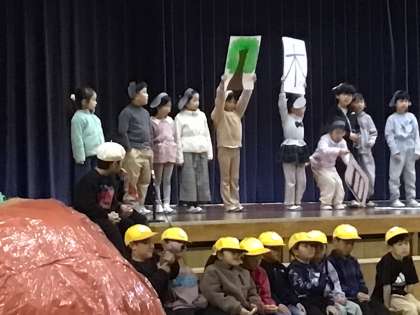 大きなかぶの劇の中に、国語で学習した漢字の成り立ちや、算数で学習した時計の読み方、生活科で学習したバッタの種類など、学習したことがたくさん出てきました。