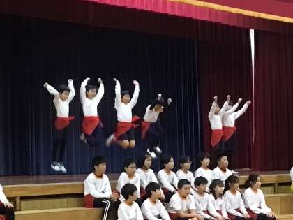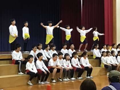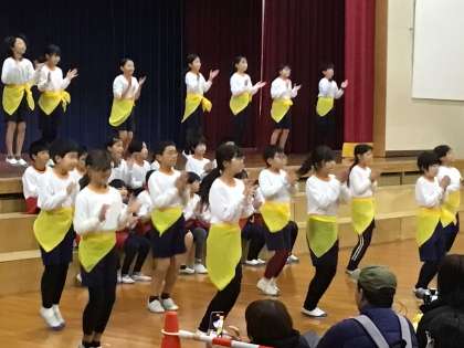 4年生は、総合的な学習の時間で、「健康」をテーマに、春から学習を積み重ねて来ました。授業の中で、「走る力」「蹴る力」「キャッチする力」「握る力」「跳ぶ力」「投げる力」「伸ばす力」など、それぞれを鍛えるストレッチや動きを調べました。それらを組み合わせて、楽しみながら体力アップが図れるダンスを作り、披露しました。