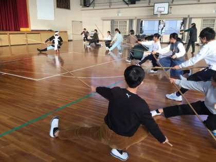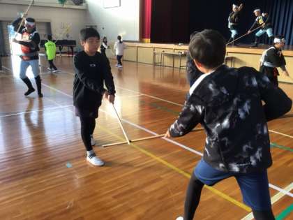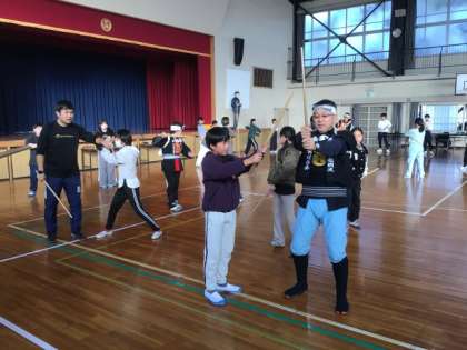 児童は棒と太刀に分かれ、それぞれの型を、講師の先生から習いました。何回も何回も練習して、最後に棒と太刀の2人1組で、演舞を行いました。