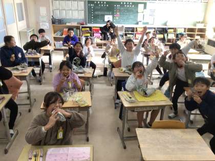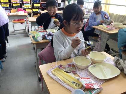 皮を剥いてかぶりつく児童や、スプーンですくって食べる児童もいました