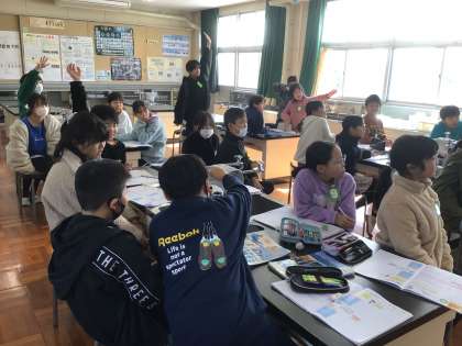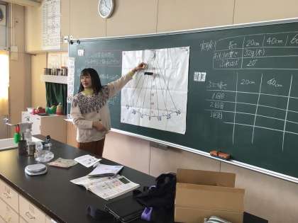 12/9の学習では、黒板に取り付けた実験器具を使って、ふりこの1往復にかかる時間は、どんな条件によって変わるのかを考えました。児童からは、「糸の長さ」「おもりの重さ」などの意見が出て、確かめていました。