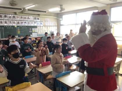 3年生は、大きなサンタの登場にびっくりしていました。児童はサンタクロースと楽しく英語の歌を歌いました。また、英単語探しなど、クリスマスゲームを楽しみました。