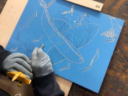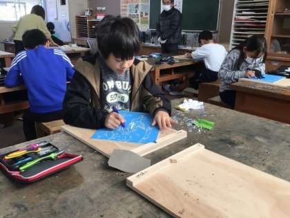 12/12の学習では、地域や保護者の彫刻刀支援ボランティアから支援いただいて、版木を彫り進めました。失敗しないように、ゆっくりと彫刻刀で彫り進めました。版木のデザインを見ると、生き生きとした海の生物が描かれていました。