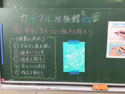 5年生の図工では、「カラフル水族館」に取り組んでいます。これは、水族館でみられる生物をデザインして、版画作品を制作します。