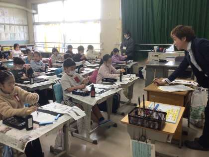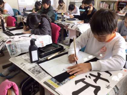 12/16の3年生での書写では、地域の書道講師をお迎えして、書き初め練習を行いました。細筆の持ち方や、名前の書き方を教えていただきました。