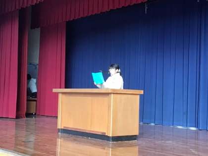 青少年赤十字主催、リーダーシップ・トレーニングセンターに学校を代表して参加した児童から、そこで学んだことの発表がありました。「初めて会った子たちと友達になり、一緒に協力することの大切さ」を発表しました。