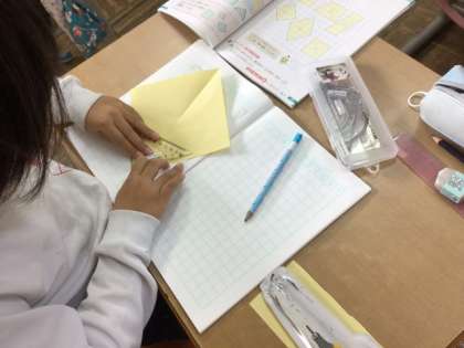 1/9の学習では、長方形から正方形を作り、その角の形を三角定規をあてて調べました。児童は、4つの角がすべて直角になっていることを理解しました。また、正方形の4つの辺の長さがすべて同じ長さであることも確認しました。
