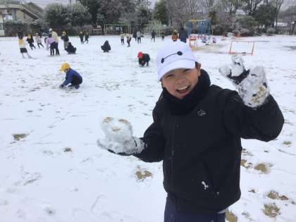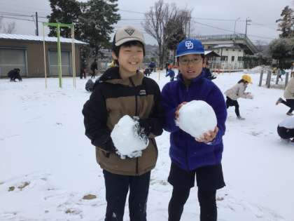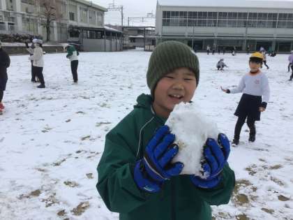 大きな雪玉ができた子は、はじけるような笑顔を見せてくれました。
