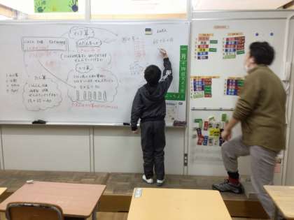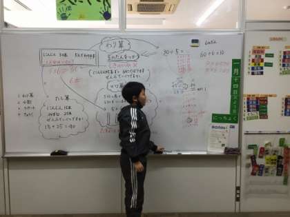 1/14の授業では、60÷6の解き方を考えました。「6の段をずっと言っていって、60になるまで探すと見つかる」と発言し、その考え方をホワイトボードで説明しました。