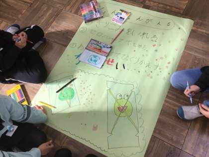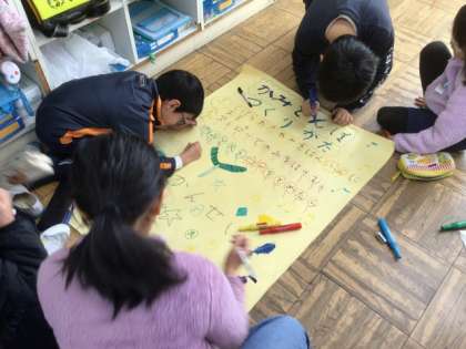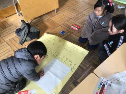 1/14の学習では、1年生に対してわかりやすく説明するために、模造紙におもちゃの作り方を書いていました。色やイラストを使ってわかりやすくしていました。