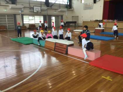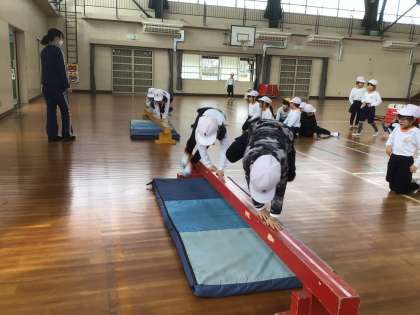 1年生の体育では、跳び箱や平均台に挑戦しています。