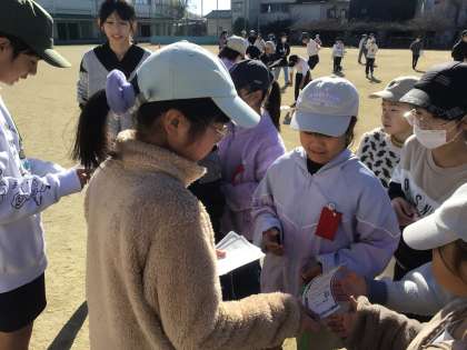 長い休み時間になると、多くの児童が運動場にでて、縄跳び練習を始めました。運動委員が合図をして、「1分間前跳びチャレンジ」を行いました。自分が設定した目標回数をクリアした児童は、運動委員児童から、賞状をもらっていました。
