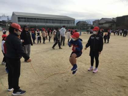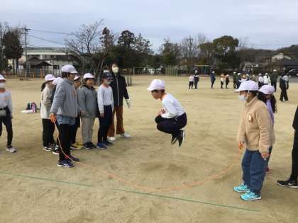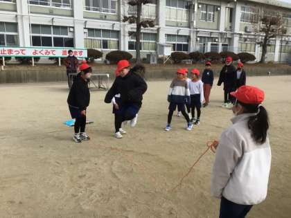 これは、縦割り班であるフレンド班ごとに8の字跳びに挑戦し、その回数を競うものです。1/27の長い休み時間には、全校児童が外に出て、8の字跳びを練習しました。8の字跳びを苦手としている児童に対して、同じ班の児童が縄に入るタイミングを教えていました。苦手な子がうまく縄に入りジャンプに成功すると、「やった〜」と班全体で喜んでいました。