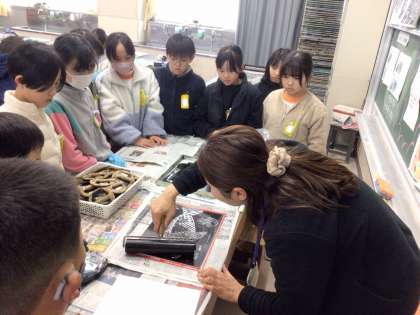 2/3の学習では、版画の刷り方について学びました。まず、ローラを使ってインクを付け、版木にに塗り、紙をのせてバレンでこすりました。きれいに版画が刷り上がると、児童から歓声が上がりました。
