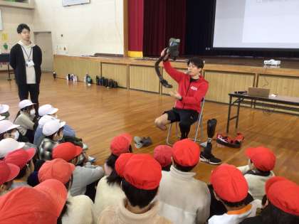 最初に、講師さんから、ここまでの努力の生き方と、義足のつくりや、はめ方を教わりました。次に、体験用の義足をはめて、児童はマットの上を走ってみました。最後にみんなでボッチャを楽しみました。