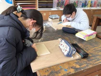 2/3の授業では、下絵に合わせて彫り進めました。木版画と違って、立体的になるように意識して彫っていました。保護者ボランティアさんが、ケガをしないように、見守ってくださいました。保護者ボランティアさん、ありがとうございました。