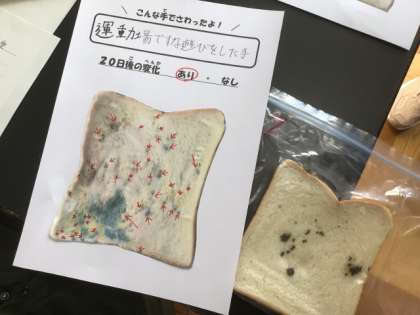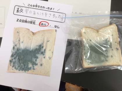 保健委員会では、校内のある場所を触った手で食パンを触り、20日間放置した実験の結果をまとめていました。触った場所は、「運動場の砂」「教室の机やいす」「遊具」「ボール」「階段の手すり」「トイレのレバー」などでした。どの場所も、食パン一面に緑、茶色、ピンクのカビがさきました。
