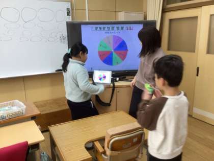 プリント学習が終わったら、学習用タブレットを使って、フルーツのルーレットをみんなで作りました。ルーレットに「いちご」「ぶどう」「みかん」「バナナ」「メロン」「りんご」「すいか」「もも」の言葉を入れ、ルーレットがとまったフルーツの言葉分だけすごろくを進めます。3人で競争をして、3人同時にゴールをしました。