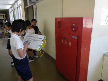 社会科「火事から身を守る」の学習で、学校中の「火事から身を守るための工夫」を探しました。熱探知機や消火器がたくさんの場所に設置されていることや、ガス感知器が家庭科室にたくさんあることなどを発見しました。