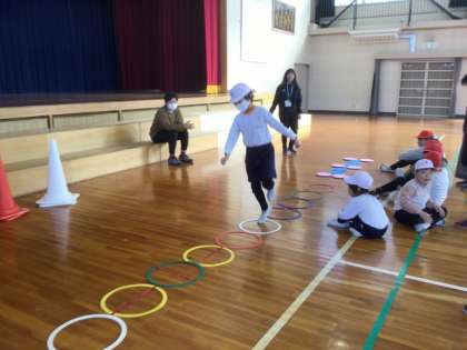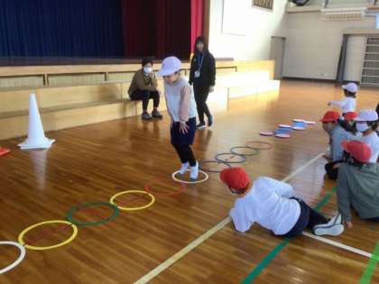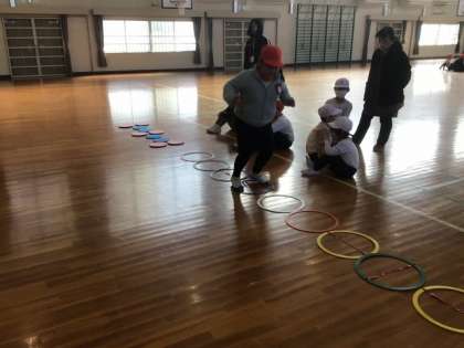 2/13の体育では、体育館のフロアに小さな輪っかを並べ、ケンケンパをしました。輪っか1つは片足、2つは両足で着地します。輪っかの直径に赤いテープが張ってあるものは、体を90度や180度回転させなければなりません。