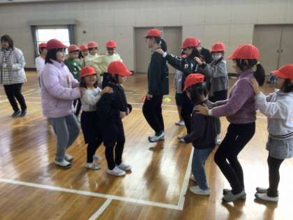 フレンド遊びの最初は、5年生によるゲームのルール説明でした。言葉だけでなく、見本を見せて、わかりやすい説明でした。ゲームが始まると、1〜6年が一緒になって楽しみました。
