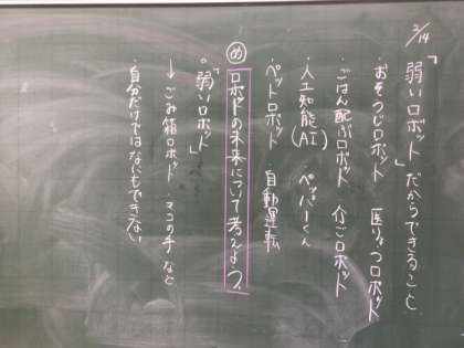 5年生の国語では、「弱いロボットだからできること」を学習しています。説明文を読んで、完ぺきではない「弱いロボットだからこそできること」を考えあいました。
