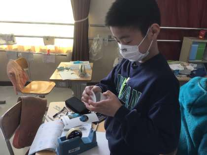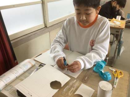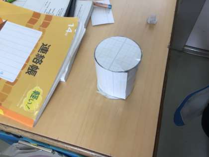 2/19の学習では、厚紙に円柱の展開図を書きました。円の半径から割り出した円周の長さを使って、ピタリと円の周りに合わさるように作っていました。「先生、できたよ!見て!」と見せに来てくれました。