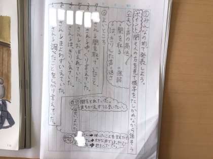 2/19の学習では、前回の友だちの発表動画を見て、発表の仕方の良さを見つけました。友だちの良さを、ノートにまとめていました。