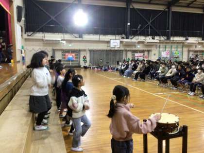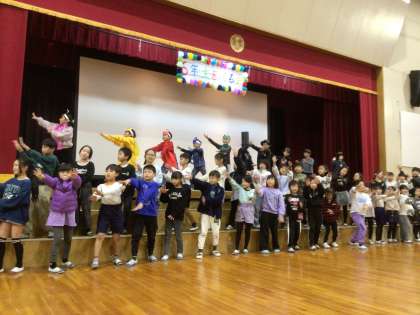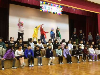 2年生は、伊保の自然を破壊する悪者が登場し、自然を守るレンジャーが悪者を倒す劇でした。これも、6年生が委員会の発表でよく見せてくれた劇をなぞらえたものでした。劇の後は、6年生のすごいところを歌にして、2年生が歌いました。