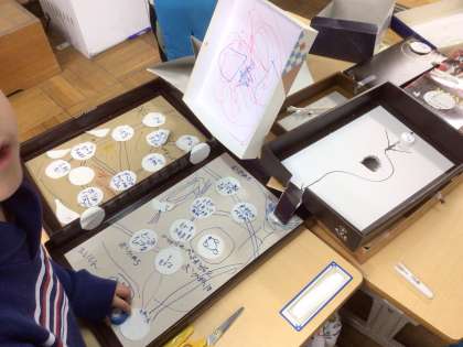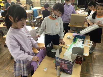 3/13の学習では、家から持ってきた空き箱を使って、すごろくを作りました。一人で作ったり、グループで作ったりしました。