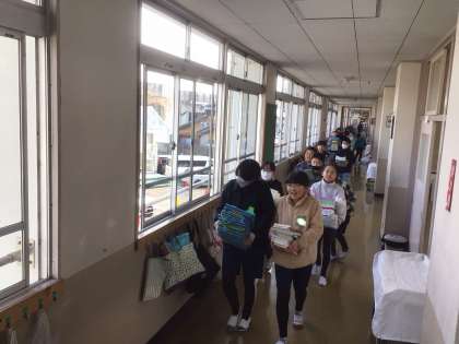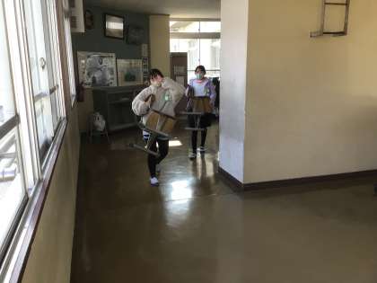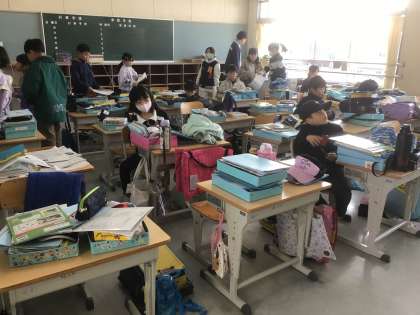 教室をきれいにして、児童は自分の荷物をまとめて、1学年うえの教室に引っ越ししました。机を運ぶ児童の表情は、晴れやかでした。