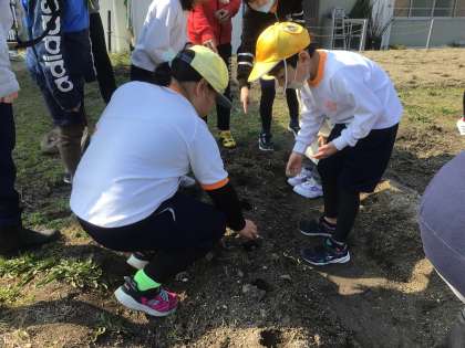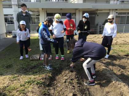 特別支援学級は、3/21にジャガイモの種芋を植えました。最初に先生に植え方を教わりました。説明を聞いた後、児童は畝の穴に種芋を置き、優しく土をかけました。児童は、「ここ、あいているよ」「お芋の向きが違うよ」と、声をかけながら植えていました。
