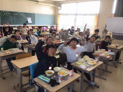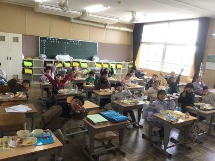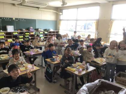 3/21は、今年度最後の給食でした。児童は新しい教室に引っ越しをしました。児童は新しい教室で、今年度最後の給食を楽しみました。